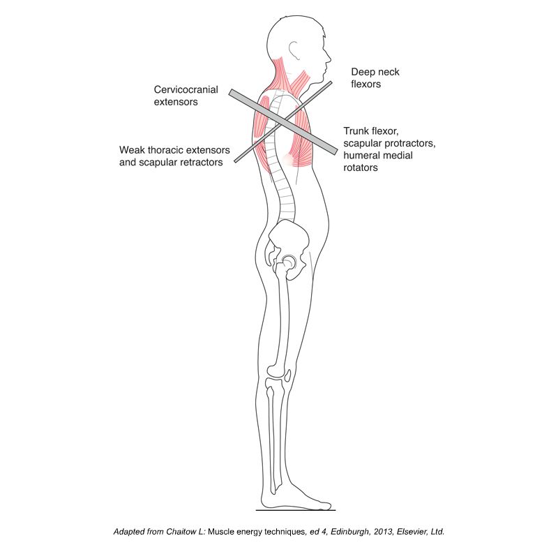 頸伸肌群、軀幹屈肌、肩胛前引肌群過短